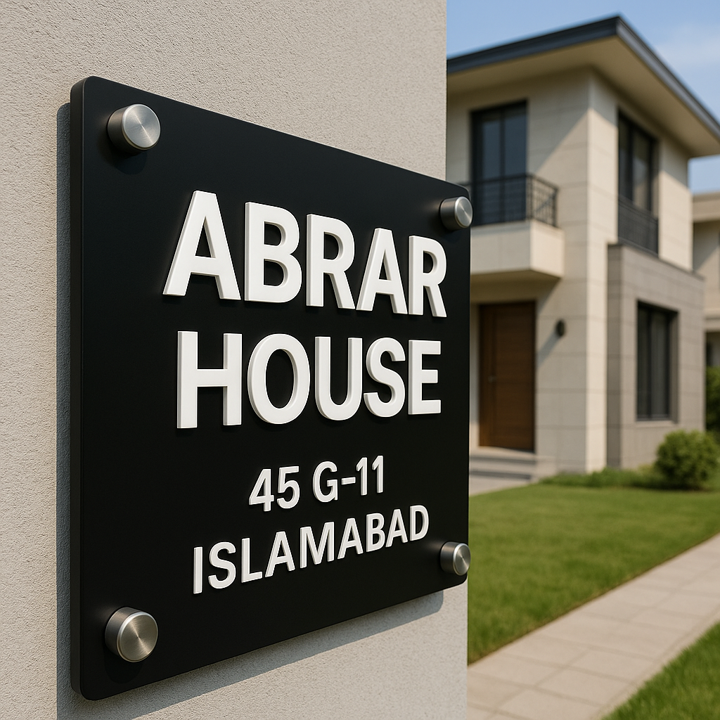 Made from high-quality laser-cut acrylic, this name plate is built to last. It comes with stainless steel studs for secure installation, making it perfect for main gates, boundary walls, or entry columns in Pakistani bungalows and villas.